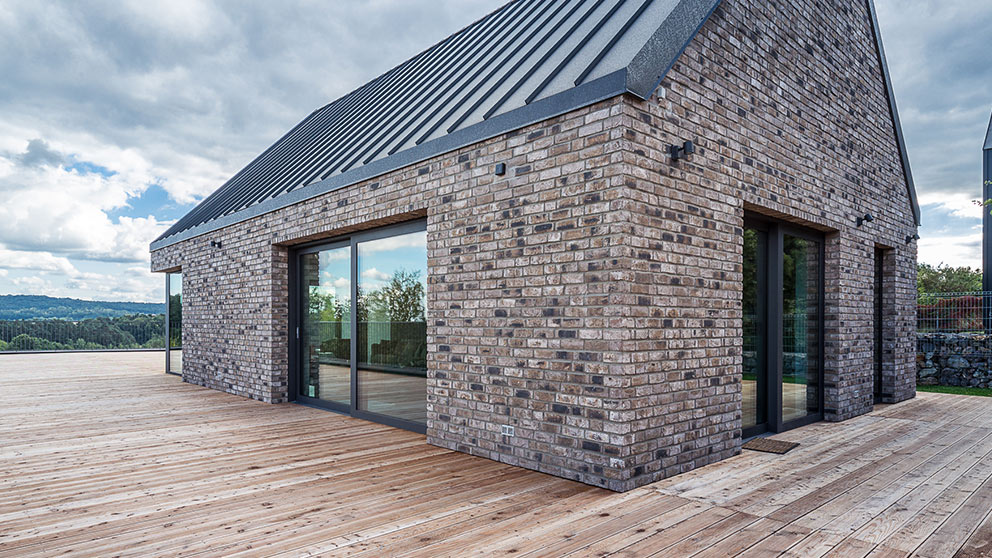Okna w odcieniach szarości takich jak antracyt bardzo dobrze korespondują z ciemnym, spadzistym dachem. Wydają się naturalnym przedłużeniem dachu.